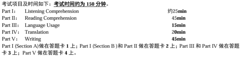 九、听力的填空部分(Part I Section A) 、阅读的简答题部分 (Part II Section B) 、语言知识 (Part III) 、翻译 (Part IV)及作文 (Part V) 用规定的黑色字迹签字笔 ( 大于或等于 0.5mm )书写。答卷内容不要超过规定的框,超越部分无效。考试规定时间到后,不按时交卷者将被取消此次考试成绩。