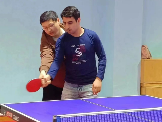 随后,大家进入乒乓球场馆亲身体验乒乓球的魅力。部分曾经从未接触过乒乓球的留学生们主动地和受邀而来的校乒乓球队队员进行学习、交流。