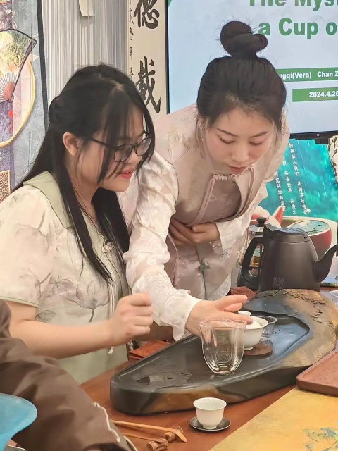 4月25日下午,英文学院“理解当代中国,知行活力浙江”跨文化交际时光活动第七期如期开展。来自21英师4班的张星琪以中国茶文化为主题,带我们了解了中国茶文化的历史以及各类茶叶的特色,感受中国深厚的茶文化氛围和历史底蕴。活动现场,来自墨西哥,法国,摩洛哥等国家的留学生们与英文学院的师生在小石光开启了一段悠然的品茗时光。