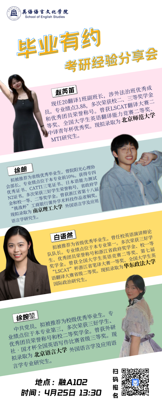 为帮助学院学子更全面地了解考研信息,建立清晰的备考目标,做好科学的备考规划,英文学院开展“毕业有约”第三期——考研经验分享会,邀请到了四位成功上岸的学长学姐们,向同学们系统地分享他们的“上岸心得”。