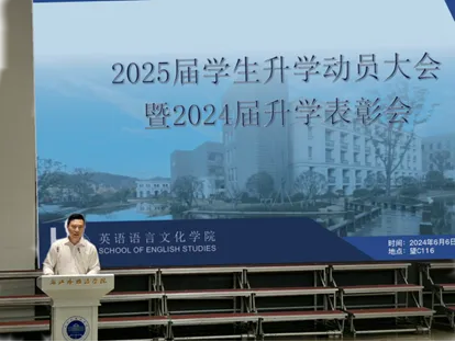 欧万彬主持,并总结了2024届毕业生升学情况,分析2025届学生考研升学形势。他表示,在研究生考试人数屡创新高、考研报录比持续走高的形势下,英文学院学生升学成功率能够稳步提升,2024届毕业生国内考研上岸率和出国(境)深造人数、进入双一流大学和QS排名前100大学的学生比例更是创历史新高,这体现了学院在教学质量和学生培养方面的卓越成就,这也为有意向升学的同学们传达了积极的信号,鼓励大家不断学习、不断进步。