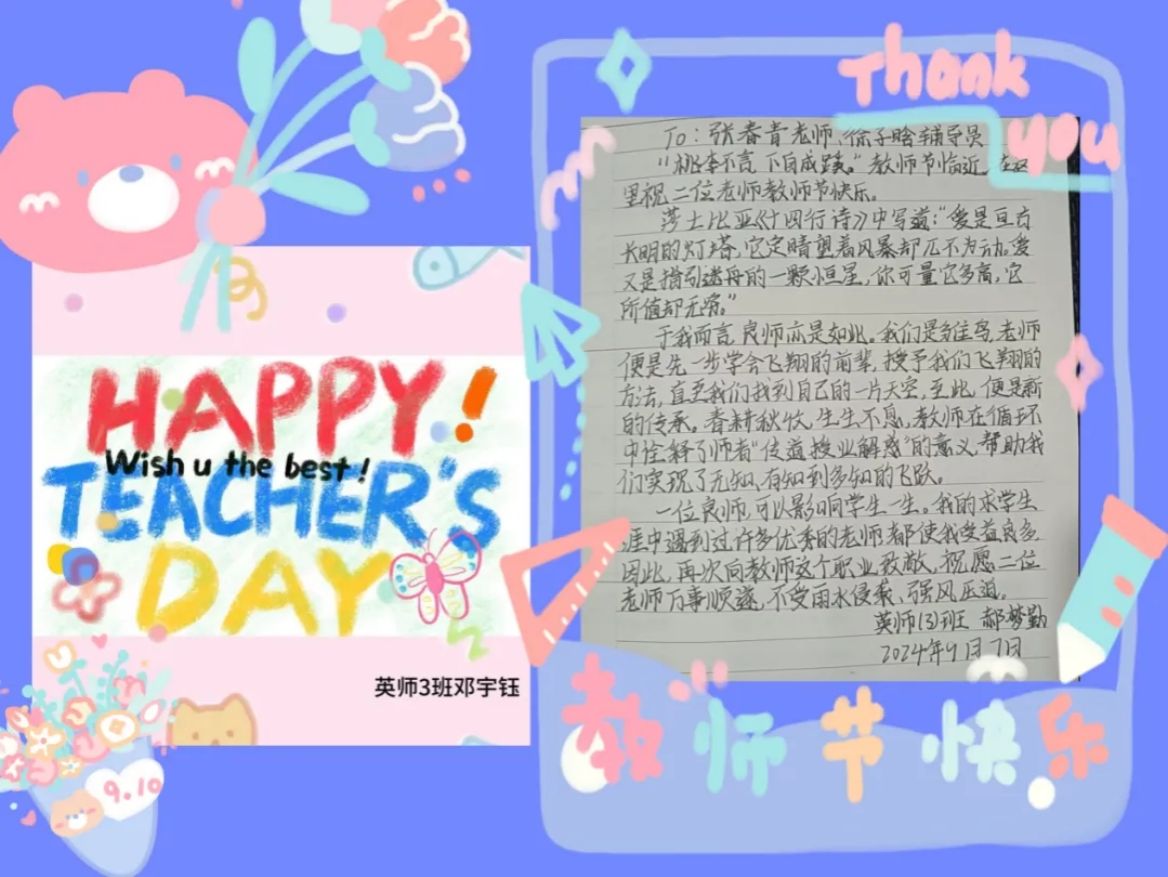 在这个特别的日子里,我怀着无比真挚的心情,向所有老师致以最深的敬意。尤其要特别感谢我的综英课老师——盛老师:在课堂上,是您用温柔的话语鼓励我们勇敢地表达自我,每次不自信的回答却会得到您由衷的表扬。是您细致入微、认真负责地指导我们进行专四的学习,与同学们共同努力之下,我们实现了从模拟测试垫底到百分百通过率的飞跃!盛老师,教师节快乐!愿您幸福安康,岁月悠悠如诗,美好时光常伴左右!