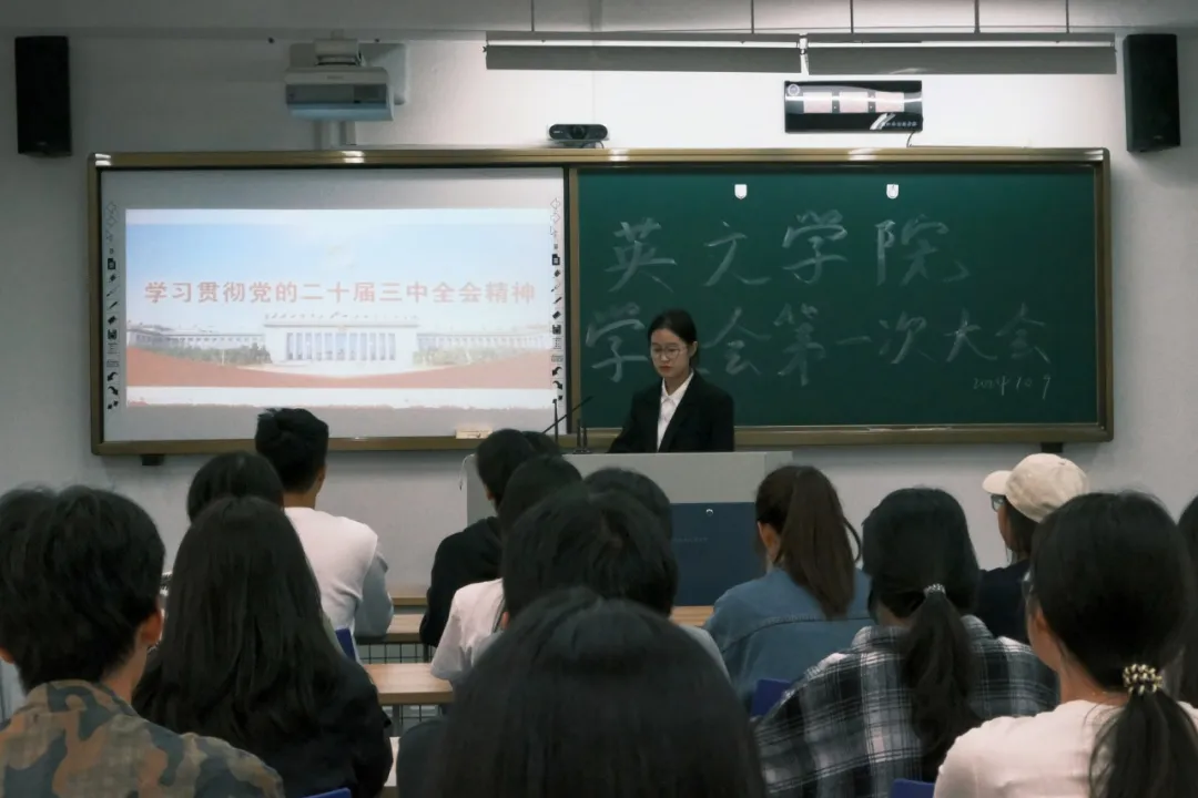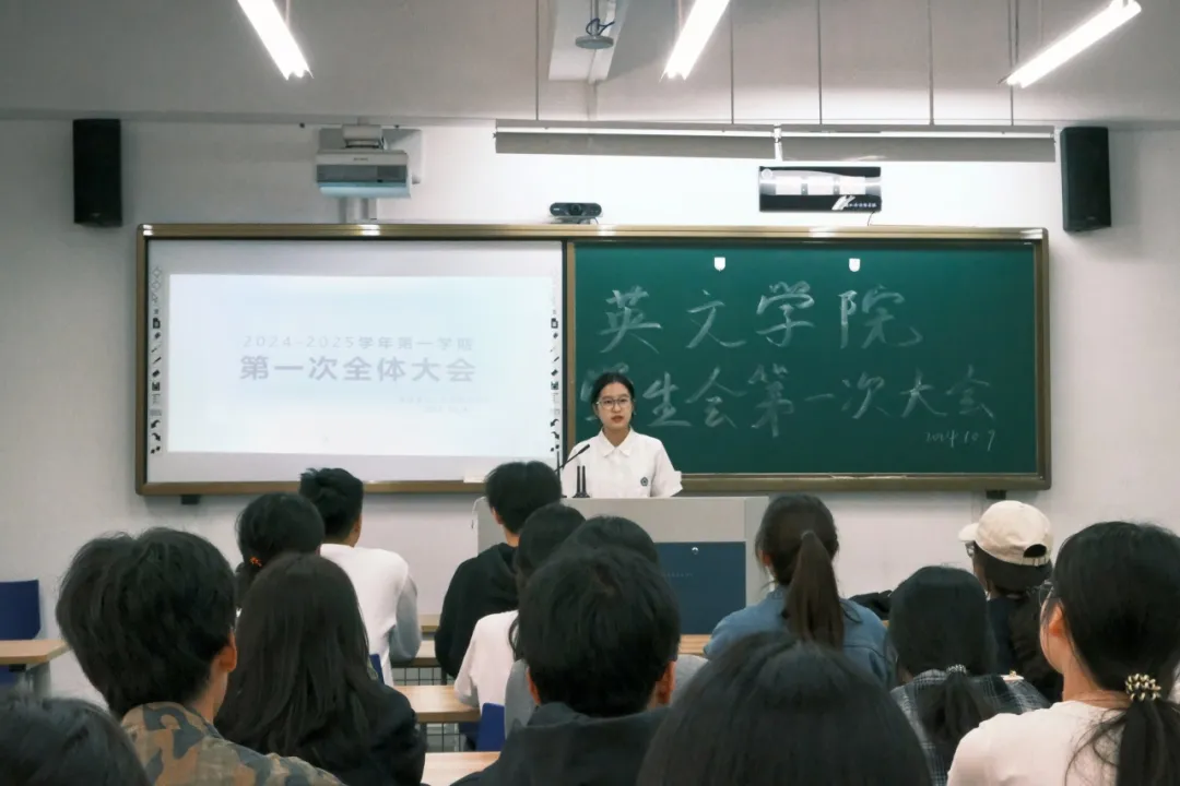 为深入学习贯彻习近平新时代中国特色社会主义思想和党的二十届三中全会精神,提升英文学院学生会各部门工作效能,进一步推动学生工作有序进行,2024-2025学年英文学院学生会第一次全体大会于10月9日在融A101顺利召开。