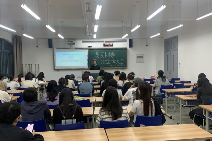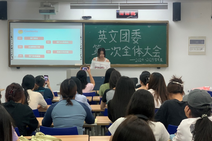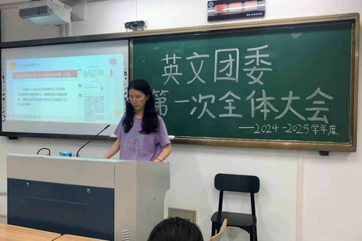 为贯彻落实习近平新时代中国特色社会主义思想和党的二十届三中全会精神,进一步推进英文学院团委工作开展,10月18日,2024-2025学年英文学院团委第一次全体大会在融A105顺利召开,团委副书记(学生)陈欣夷主持会议。