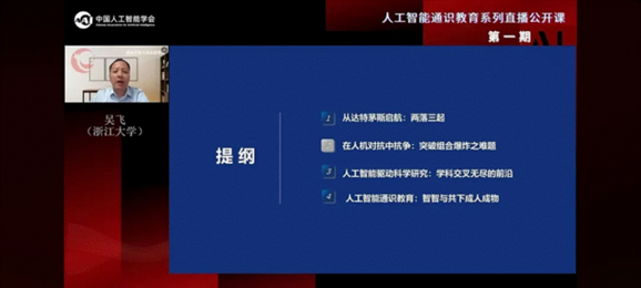 本次活动采用线上与线下相结合的模式进行,邀请了浙江大学人工智能研究所所长、计算机科学与技术学院吴飞教授作为主讲嘉宾,他以严谨的教学态度、风趣幽默的教学风格,深入浅出的教学形式,直播讲解了人工智能的历史发展过程、多学科交叉综合的特点以及未来发展应用的趋势。