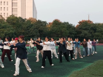 当阴阳调和,太极拳方阵是流动的水墨画卷。感受着内心的宁静,他们身形下沉,仿佛山间松柏深根大地;他们双手舒展,如同晨曦柔风轻掠湖面。一招一式,刚柔并济,蓄蕴着英院学子扶摇直上之豪壮;一起一落,天地相和,凝聚着英文学院舒天昭辉之大气!