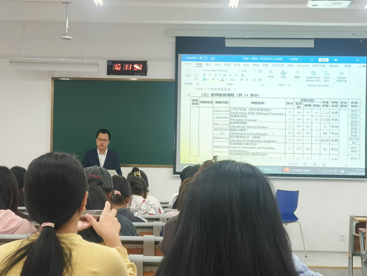 副院长陶伟在宣讲会上详细介绍了英语师范专业的人才培养方案。从专业课程设置到实践教学环节,从培养目标到就业方向,陶伟都进行了全面而细致的讲解。新生们通过此次宣讲会,对未来四年的学习生活有了初步的认识和规划,对未来从事英语教育事业的信心更加坚定。