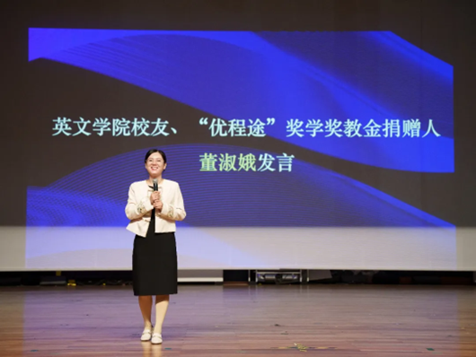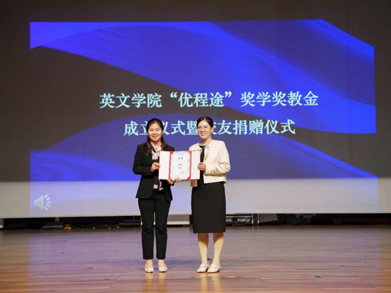 会上,进行了英文学院“优程途”奖学奖教金成立仪式暨校友捐赠仪式,田俊杰和学院2007届校友、杭州优程途留学有限公司总经理、创始人董淑娥共同为“优程途”奖学奖教金揭牌并交接捐赠支票,田俊杰向董淑娥颁发捐赠证书,并代表学院聘任其为留学导师。