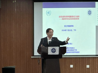 11月22日下午,联合国粮农组织原副总干事、国际欧亚科学院院士、北京大学兼职教授何昌垂博士为英文学院师生做了题为“全球治理与青年国际胜任力培养”的讲座。国际关系研究团队教师代表章珏博士、学院各年级学生代表参加此次讲座。讲座由学院特聘教授张贵洪主持。