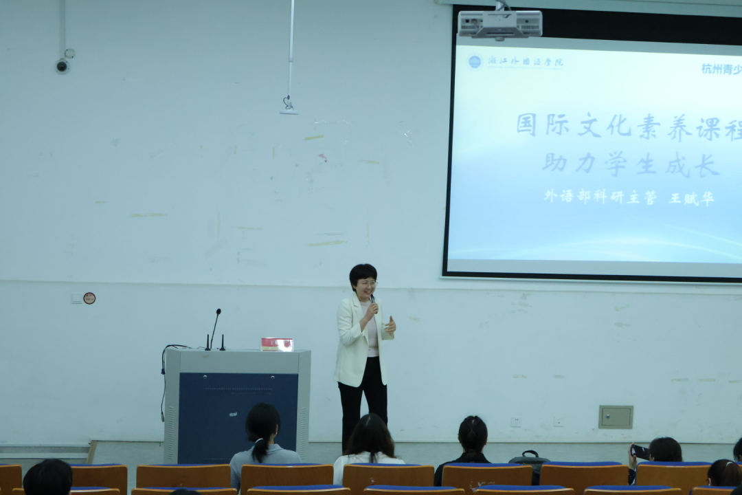 杭州青少年活动中心外语部科研主管王赋华就“国际文化素养课程如何助力学生成长”展开分享。从语言艺术融合课程、世界文化探索课程、国际素养扩展课程、社团活动实验课程等入手,具体分析了英乐汇、SAM侦探团等教学内容,帮助同学们更好的了解了活动中心课程建设。
