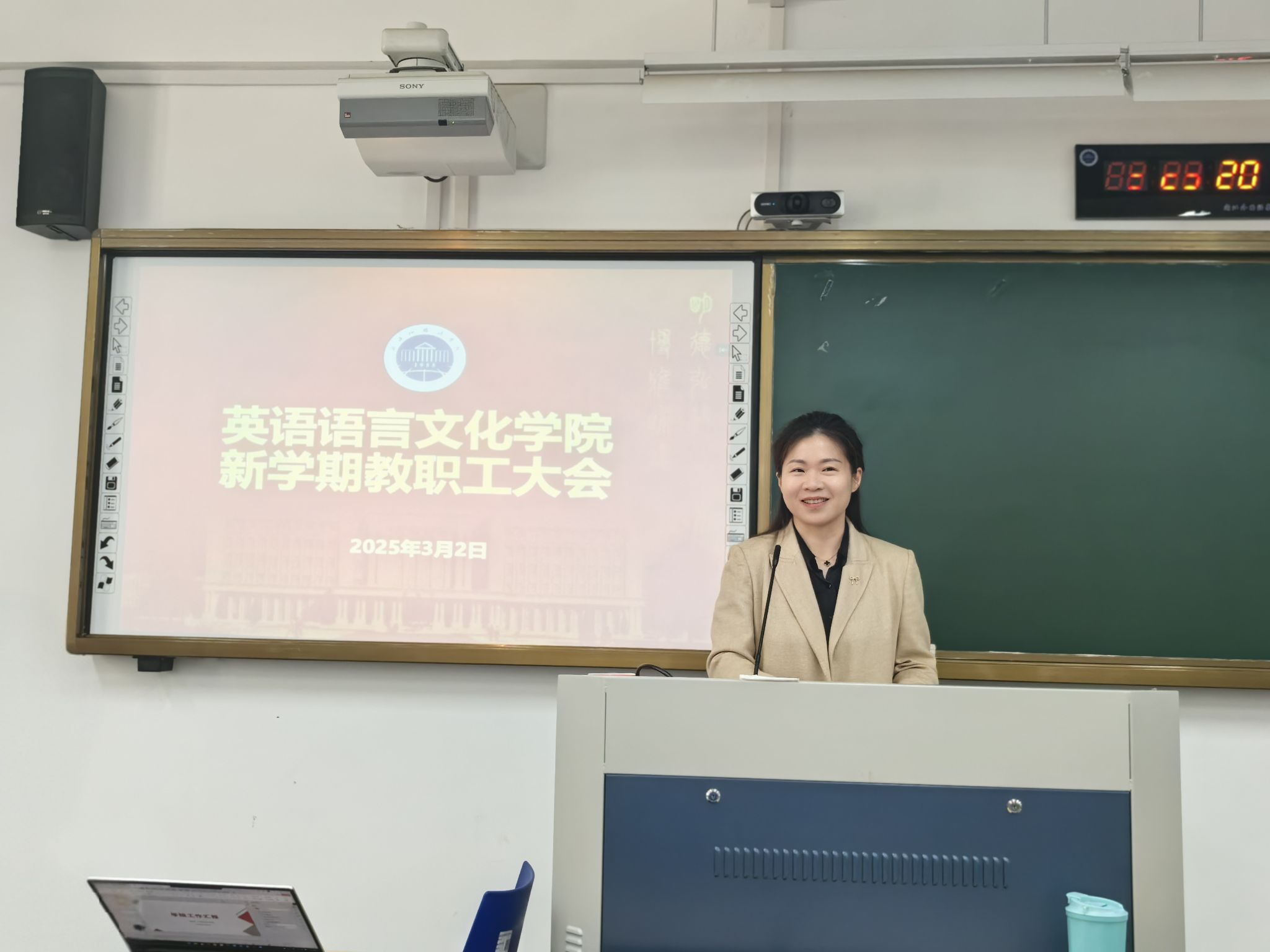 英文学院于3月2日召开新学期全体教职工大会。学院党政领导、特聘教授、专任教师、外籍专家、管理人员和辅导员等近70人参会。会议由学院党委书记田俊杰主持。