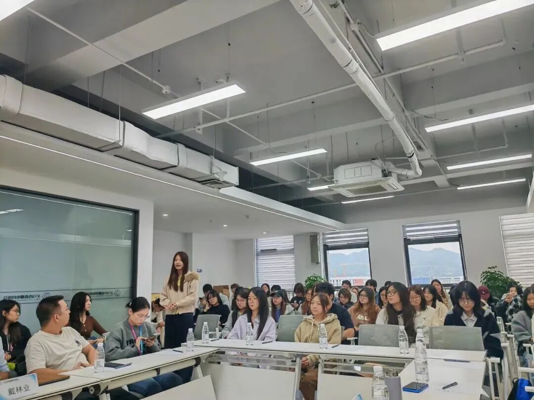在参观饰品展示区时,师生们细致考察了商品的定价机制与市场销售状况。随后举行的交流座谈会上,语跃龙门学院杭州校区校长戴林业系统介绍了“语跃龙门”学院的教学模式,并着重阐释了英语在商务实战中的具体应用。麟栩弘量科技CEO何麟毅则就全球贸易通集团及其外贸SAAS平台的功能与价值进行了分享。此外,相关专家围绕跨境电子商务中的“按需生产”(POD)模式做了专题讲解,指出该模式凭借订单驱动生产,有效实现了零库存、低风险与高利润,显著降低了行业运营门槛,并能充分满足市场的个性化定制需求。行业专家们的讲解引发了在场师生的热烈探讨。