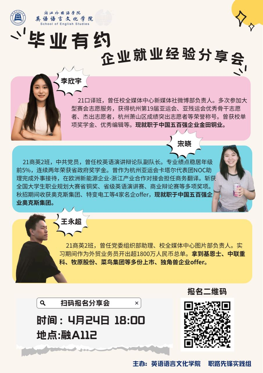 为助力同学们明晰就业方向,精准把握求职要点,"E+"圆桌派之“毕业有约”特邀数位成功入职知名企业的学长学姐。他们将毫无保留地分享自己一系列求职过程中的实战经验。剖析不同行业的招聘偏好,传授独家技巧,揭秘如何在求职季突出重围,斩获心仪Offer,为同学们的职业发展之路点亮明灯!