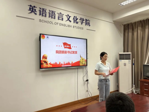 徐睿杉代表新团员发言。她表达了对理想信念的坚定,承诺将持续在学习和生活中努力拼搏,并为共产主义事业奋斗终身。学院团委组织部部长伍桢颖作为老团员代表宣读《团章》中有关团员的义务和权利条款,并予以解释。