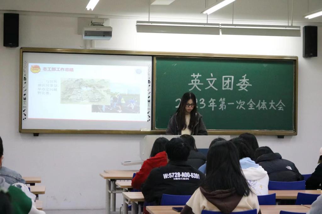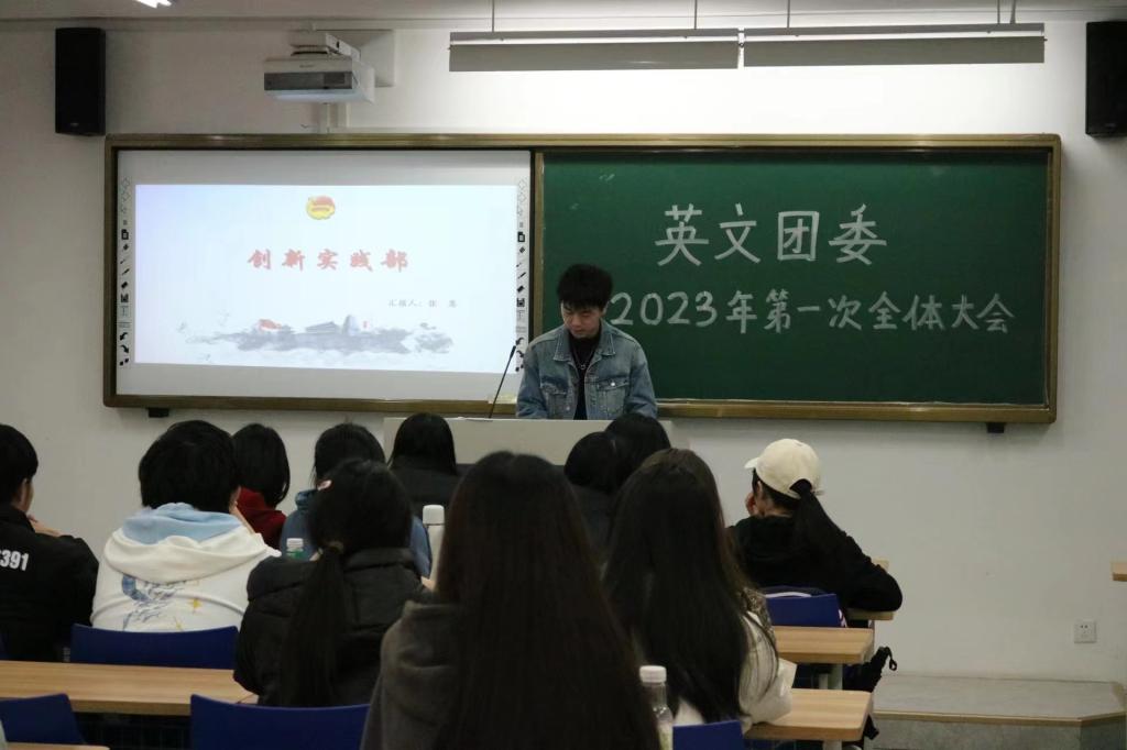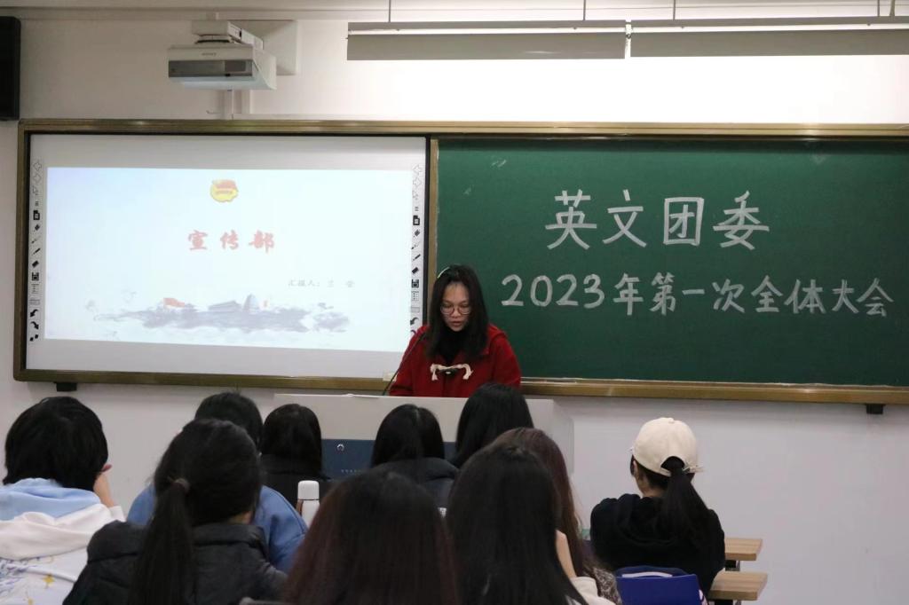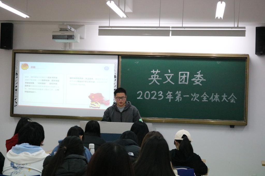 为贯彻落实习近平总书记关于青年工作的重要思想,抓牢做实《关于改革创新高校共青团工作,切实增强思想政治引领实效的若干措施》文件要求,进一步加强学生组织建设,更好地发挥共青团育人优势,3月16日下午,英文学院团委在融A105召开2023年第一次全体大会,团委全体成员参加。大会由团委组织部干事詹璐妍主持。