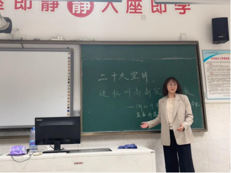 学院党总支积极组织开展支部联学、党团共学,多层面、全覆盖开展学习宣讲活动,形成了党团互促互进、共同学习的良好局面。“我们要坚持教育优先发展、科技自立自强、人才引领驱动”“广大青年要坚定不移听党话、跟党走,怀抱梦想又脚踏实地,敢想敢为又善作善成”……在支部联学会上,教师党员顾蒙从新时代十年取得的伟大成就出发,对党的二十大精神进行了解读。浙江省高校思政微课大赛一等奖获得者徐子晗老师谈到“教育优先发展”时深受启发,她说:“推动高等教育内涵式发展,要将思政元素融入学生日常管理,用心育人、用情育人,以爱为底色,做有温度的思政教育。”同时,学院还组织优秀共产党员、团支书等代表深入团支部、青年学习小组进行宣讲。