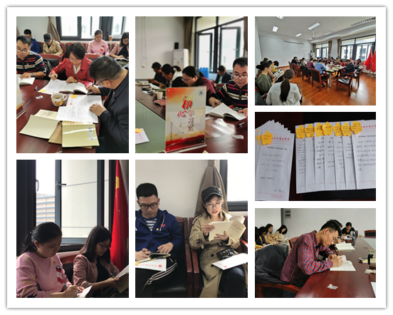 会上,理论中心组成员及全体教工党员共读《习近平关于“不忘初心、牢记使命”论述摘编》第二章及第四章内容。在原原本本读原著后,全体党员静下心、忆初心,郑重书写自己作为教育工作者的初心--“不忘初心、脚踏实地、伸手摘星”、“为师为范、求真求是、传递正能量”、“为学生所需所想不断奋斗、不断努力,做好学生的‘勤务员’”。。。。。。一句句都是对入党宣誓庄严时刻的念念不忘、对初出茅庐时“敢叫日月换新天”壮志的念念不忘、对前进中奋起拼搏情怀的念念不忘。学院党总支书记周彩英指出,希望每一名教工党员通过“忆初心、写初心”时刻将理想信背负在身、镌刻于心,以“三省吾身”的态度,找差距、抓落实,认真做好每一项工作。
