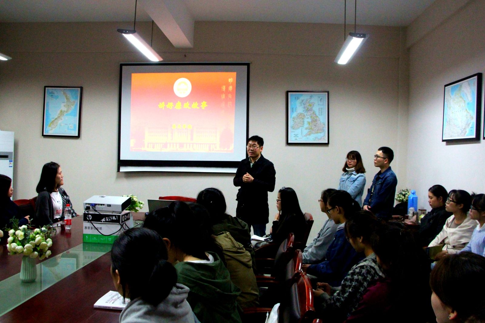 近日,英文学院党总支副书记刘涛面向全体党员上了一场温馨生动的党课,党课围绕青年学生责任与使命的主题展开,结合党的十九大报告中对青年一代的希望和党风廉政教育内容,鼓励青年党员不忘初心、牢记使命,在中华民族复兴的伟大时代中,把握大好机遇,努力成为社会主义建设所需要的合格人才,作为英语专业的学生,还要立志为世界进一步的开放和发展提供智力支持。
