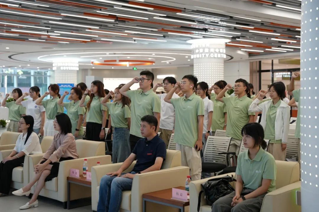 毛立峰向实践队授队旗,在实践队学生代表的带领下,全体队员庄严宣誓,他们将以专业所长服务社会,以青春热忱奉献时代,在充满光荣和梦想的新征程上,书写为中国式现代化挺膺担当的青春篇章。