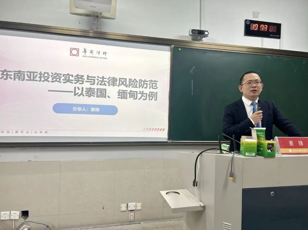 博达论坛第1072讲暨英文同文讲坛第123讲顺利举行。本次讲座以“东南亚投资实务与法律风险防范”为主题,特邀华商(杭州)律师事务所主任董锋律师担任主讲,华商(杭州)律师事务所汪江连律师、英文学院学术副院长赵歆以及2023级商务英语专业全体学生参加。