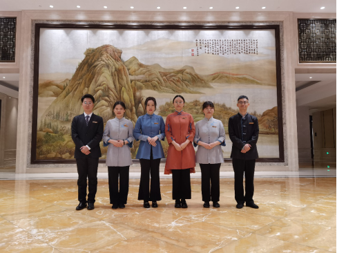 6名学生志愿者提前等候在外宾下榻的酒店——花家山庄,为即将入住酒店的外宾提供语言翻译和引导服务。