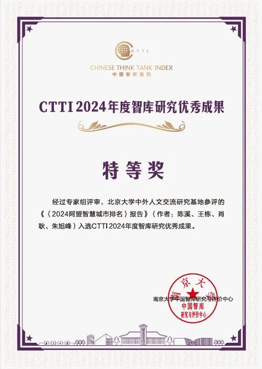 近日,英文学院特聘教授陈溪牵头完成的《〈2024 阿盟智慧城市排名〉报告》《〈2024 金砖智慧城市排名〉报告》分获 CTTI(中国智库索引)2024年度智库研究优秀成果特等奖、一等奖。此前,陈溪教授于去年牵头完成的《2023亚洲智慧城市排名》和《2023二十国集团智慧城市排名》也荣获CTTI 2023年度智库优秀成果特等奖。