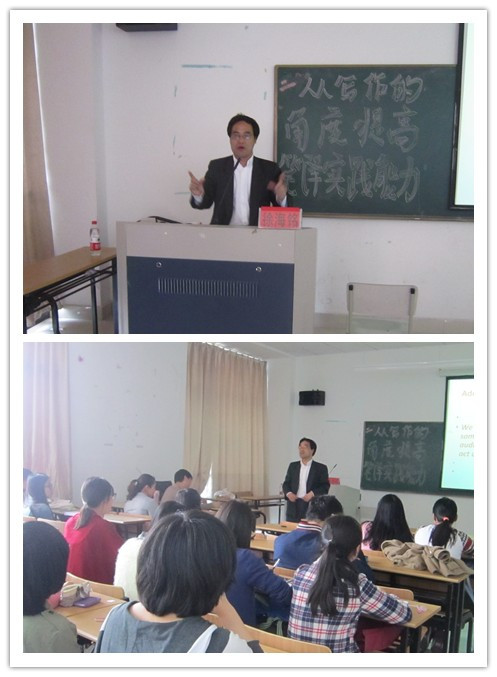 4月16日下午,英文学院特邀上海外国语大学教授、博士、硕士导师徐海铭老师来校作“从写作的角度提高笔译实践能力”专题学术讲座。讲座由英文学院英文系副主任朱武汉老师担任主持。