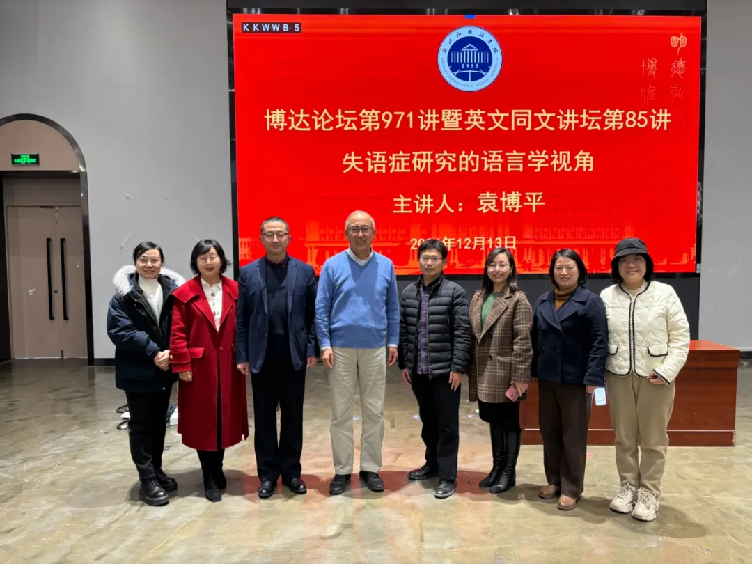 近日,剑桥大学博士生导师袁博平教授应邀参加博达论坛第971讲暨英文同文讲坛第85讲,以“失语症研究的语言学视角”为题作专题讲座,英文学院院长邢富坤主持,来自英文学院、应外学院等学院的200多名师生参加。