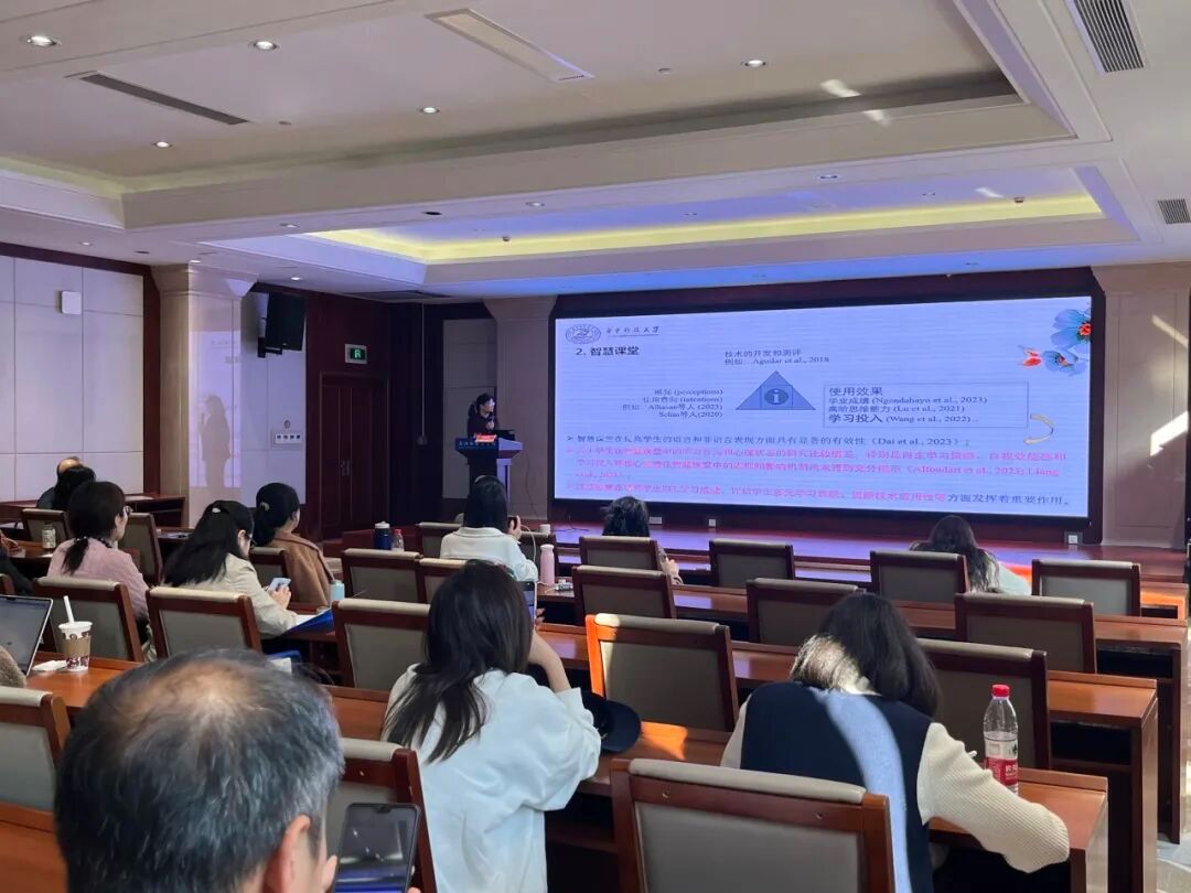 讲座中,徐锦芬结合教学实践指出,技术赋能不是工具替代,而是通过AI辅助规划、同伴支持、教师精准指导的协同模式,实现以学生为主体的个性化学习。她坦诚提及当前研究面临的挑战,比如AI反馈精准度不足、学生同伴互动减少等,这种直面问题的学术态度赢得了在场听众的认可。同时,她提出的“教学是创作,研究是深耕”的理念,让大家对学术研究与教学实践的关系有了更深刻的理解。