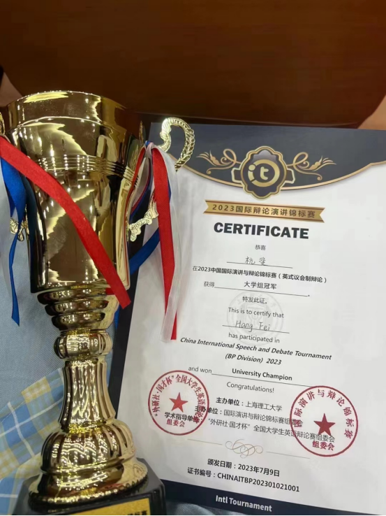 7月9日,2023年中国国际演讲与辩论锦标赛在上海落下帷幕。在充满思想碰撞和观点交锋的唇枪舌剑中,由英文学院楼翎副教授指导的2022级英语专业学生杭斐在此次比赛中脱颖而出,摘得桂冠!