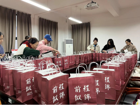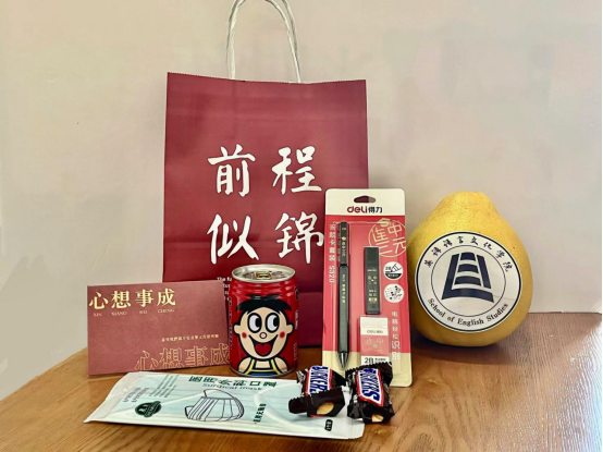 礼包外部“前程似锦”的字样,寓意着所行皆化坦途。打开这份“红”运大礼包:精美的文具套装祝愿考研学子福气满满、文思泉涌;喝下旺仔牛奶,便能一路“旺”到底,做上岸最“旺”滴崽!炫一根士力架,能量满满地迎考;戴好“逢考必过”口罩,在做好防护工作的同时,好运也常伴左右;收下这颗贴有英文学院标志的柚子,一起加“柚”吧!