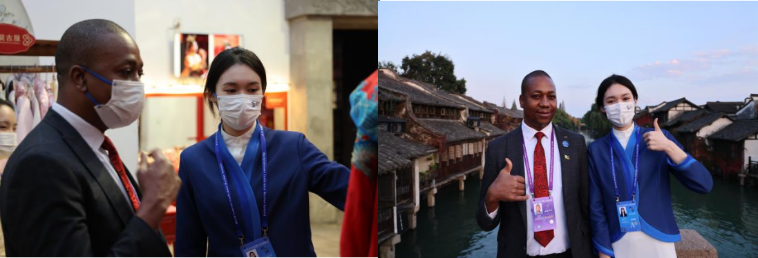 董诗宇同学负责的是接待津巴布韦驻华大使馆参赞。志愿者需要在他抵达前传递会议信息,确认健康码以及辅助完成进入桐乡的手续。在会议期间,需要根据他的参会安排制定行程等。