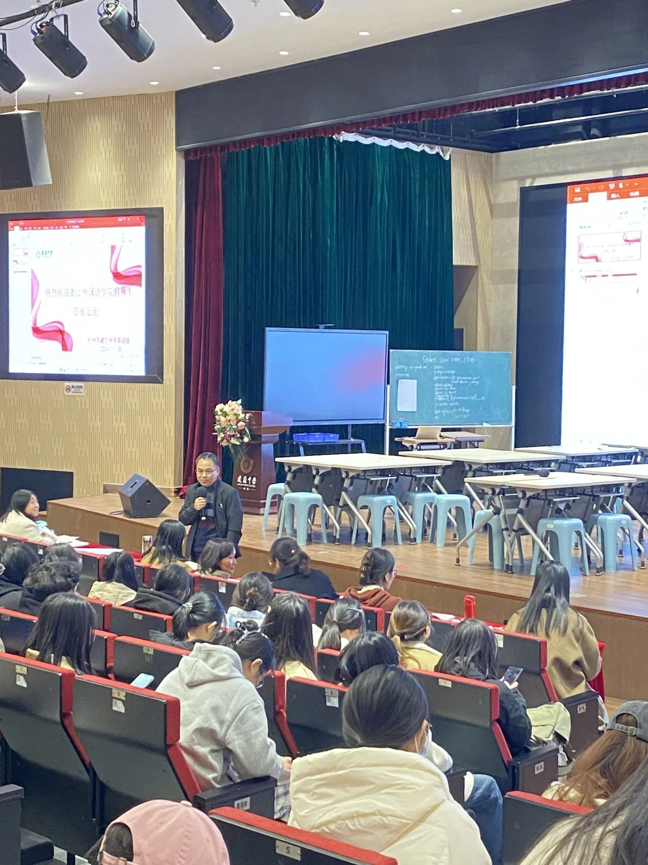 公开课结束后,两位老师向同学们介绍了各自的教学设计理念和心得反思。童红灯老师就两节公开课在课堂互动、课堂组织形式、课堂教学的各环节、教学内容等方面进行细致点评。最后,建兰中学李征校长对此次观摩活动做总结,对浙外英语师范生的成长给予殷切期望。