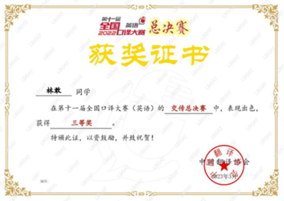近日,第十一届全国口译大赛(英语)总决赛落下帷幕。经过激烈的角逐,最终英文学院19级口译班林敢凭借扎实的双语功底在交传总决赛中获得三等奖,指导老师丁欣如荣获优秀指导老师奖。