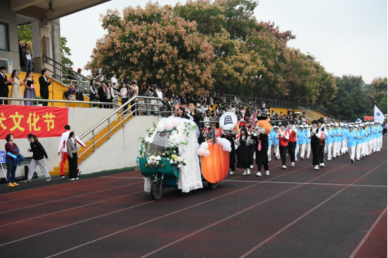 在学院吉祥物的带领下,方阵队员紧随其后