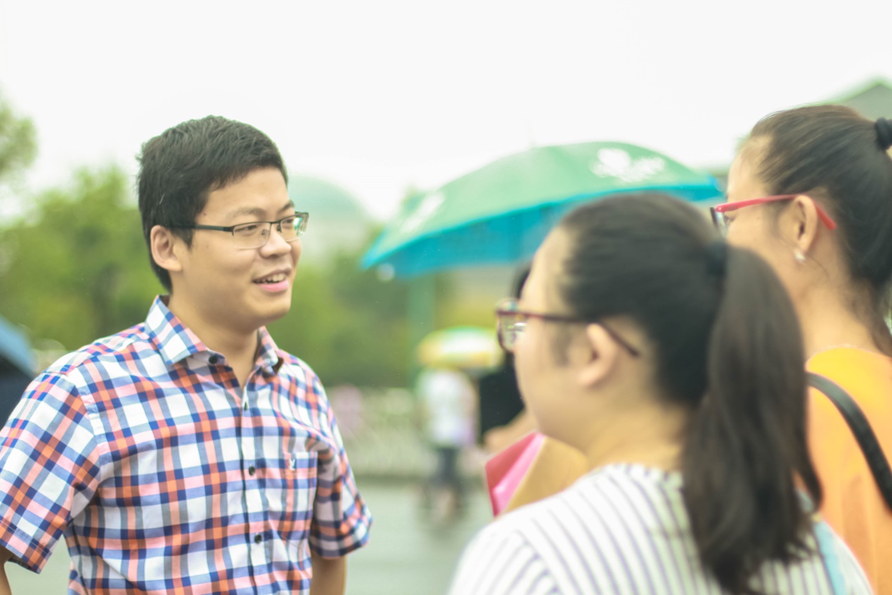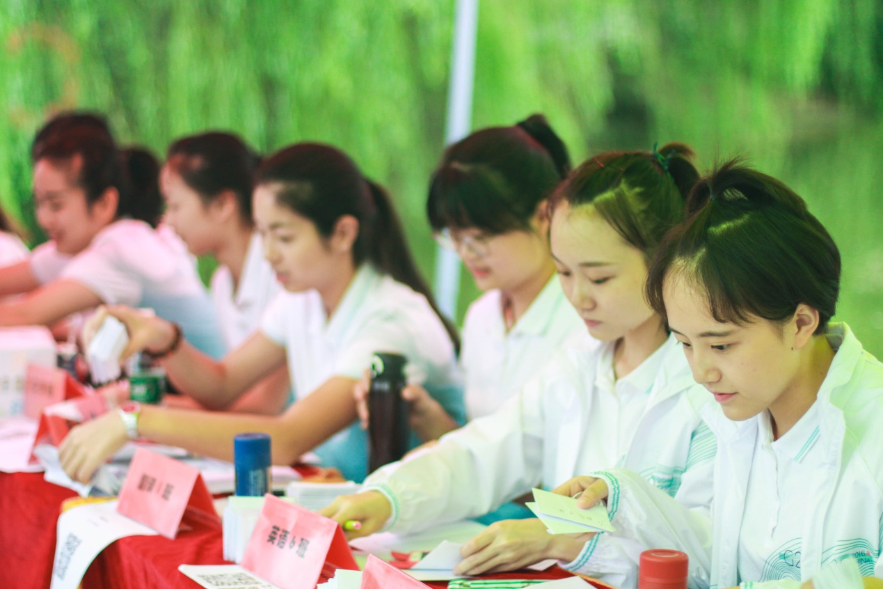 新生接待点,英文学院的辅导员们和大一各班班助们已经早早地开始等待新生们的到来。门口、路上、体育馆等处的志愿者身着绿色小马甲,微笑着为新生和家长指路。