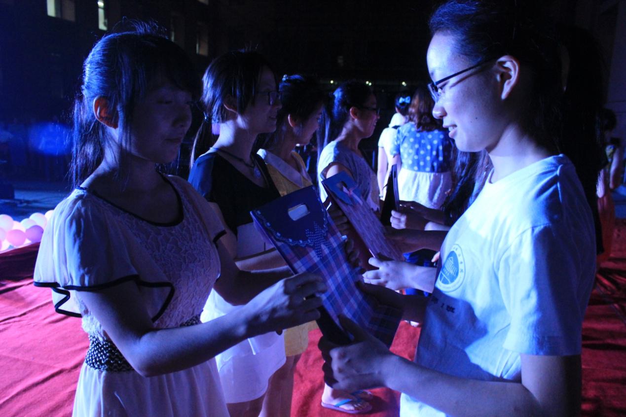 学弟学妹为2014届毕业生送上私人定制的礼物。每个本子上都写着对毕业生的祝福,每个徽章上都刻有毕业生的名字。