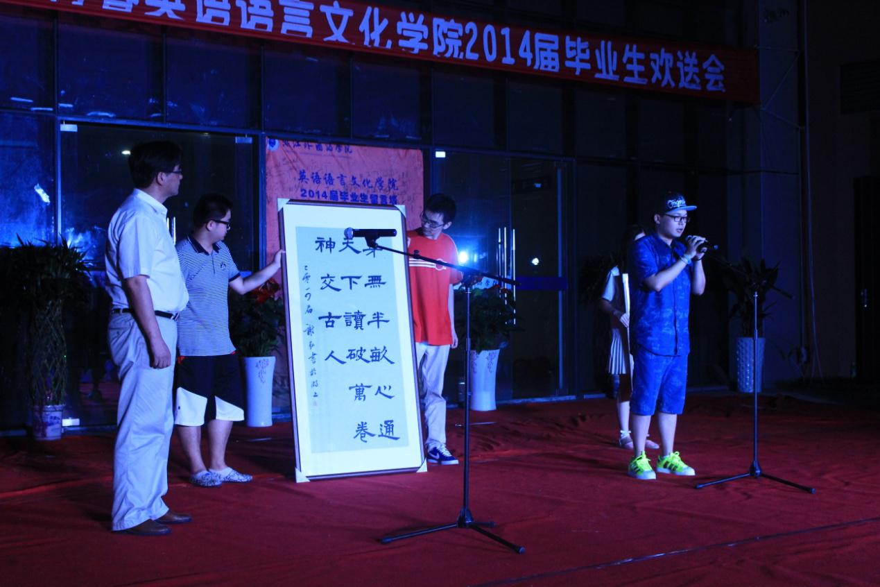 苦练书法18年,即将奔赴香港中文大学攻读研究生的2014届英语翻译专业毕业生谢弘,向恩师和学院赠送书法作品。