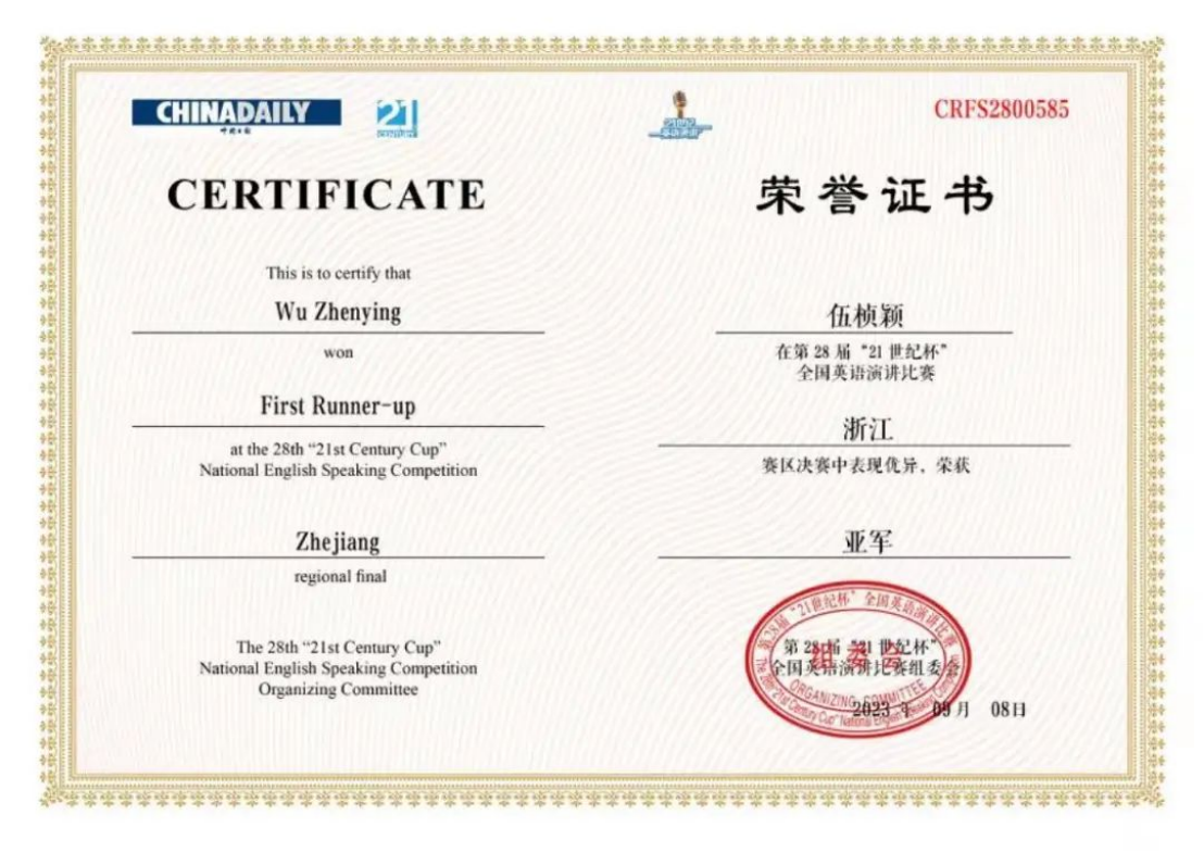 近日,“21世纪杯”全国大学生英语演讲比赛浙江省赛区决赛圆满落下帷幕。在楼翎老师和夏国建老师的悉心指导下,英文学院21英语6班伍桢颖在决赛中获得亚军,并顺利进入全国总决赛!21商英1班陈晓艳在决赛中荣获二等奖!