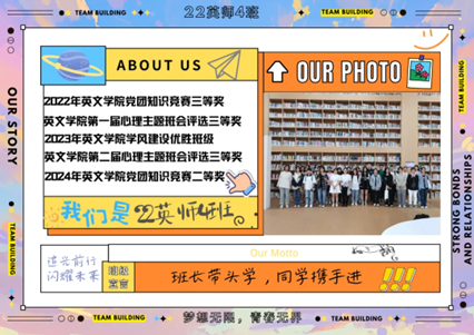 22英师4班是一个学风积极向上,成绩进步明显,社会实践丰富,志愿精神昂扬的班级!我们有亲爱的小慧和环光老师带领,我们有100%的师生互动。未来的22英师4班,更多的国奖,省奖,校奖我们来啦!!!