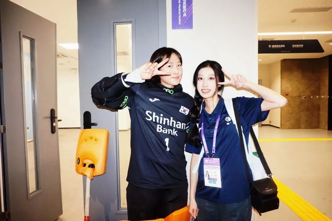 赛事期间,22级商务英语1班何媛叶作为韩国队随队翻译,24小时对接球队需求。从赛前场地适应训练、新闻发布会到赛后冰浴等工作中,全程提供精准翻译及行程协调服务。23级翻译2班陈祎涵则担任视频裁判翻译工作,每场比赛中,同步翻译裁判组英文指令,确保技术人员与现场无缝协作。