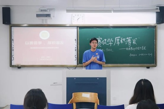 “以赛促学,厚积薄发”考研经验分享会由2022届商务英语专业校友、华东师范大学英语笔译在读研究生李致远担任主讲。他围绕本科阶段学习和考研备考两方面,介绍了自己学习锻炼、参加演讲辩论队和商务竞赛等经历,鼓励同学们多参与课外竞赛,以赛促学,全面提高自己的专业水平。对于考研备考,他建议大家注意分阶段备考,即时放松,把握好自己的节奏,循序渐进。