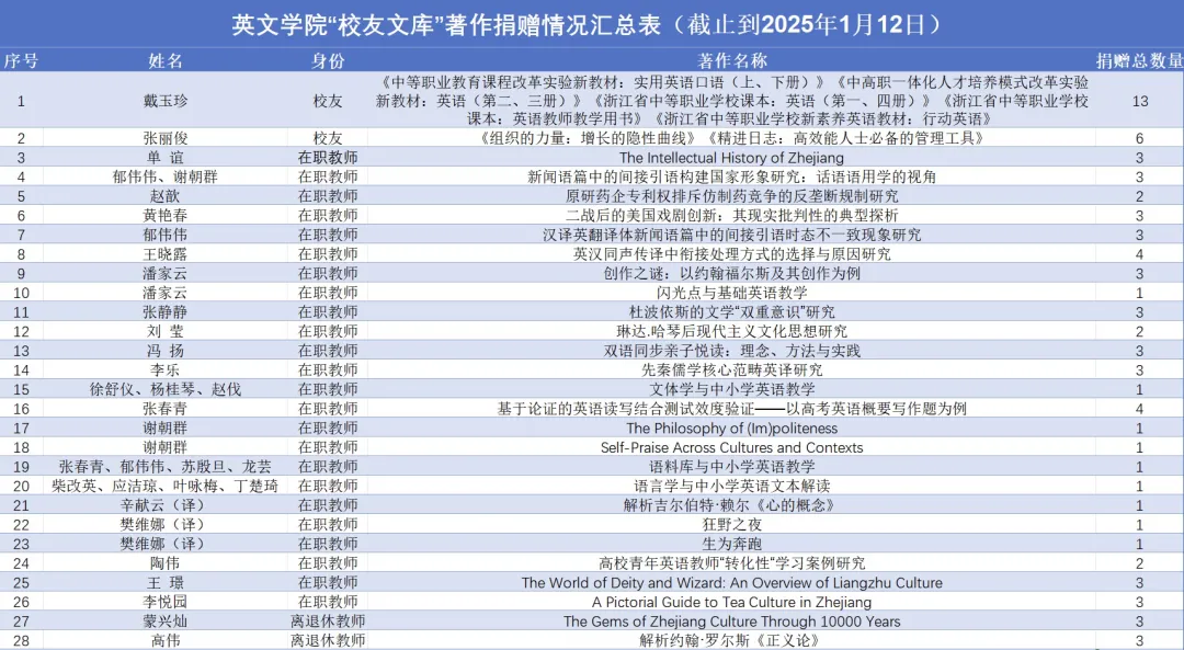 我们在此向所有为“校友文库”慷慨捐赠的校友与教师们致以由衷的感谢,并诚挚邀请更多校友与教师们加入到捐赠的行列中,以进一步弘学术精神,延续浙外文脉,彰显前贤,激励后学。