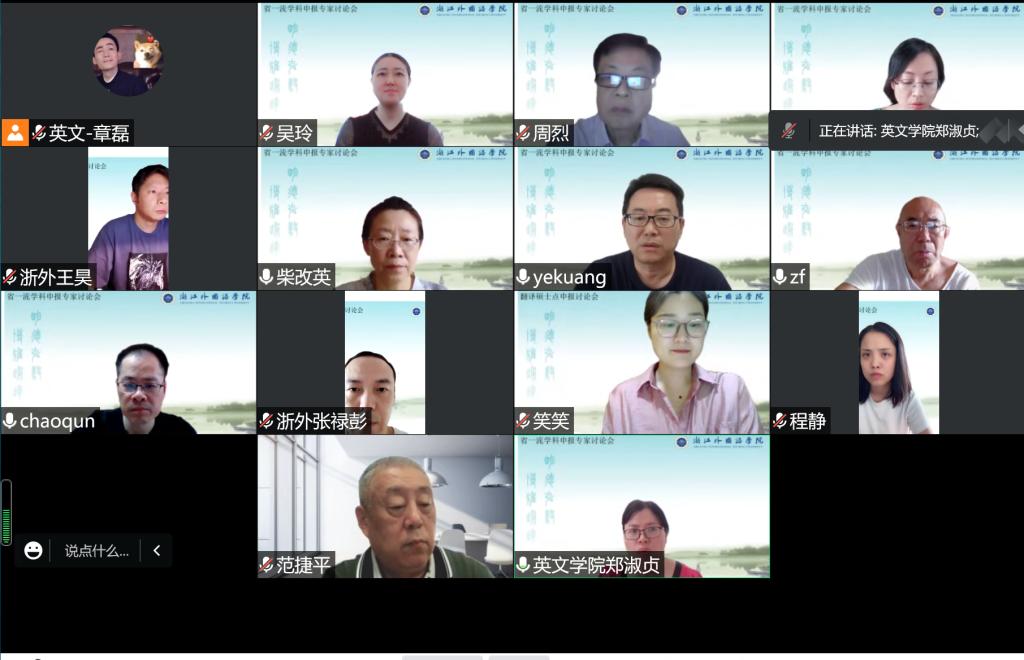 8月20日,英文学院牵头召开省一流学科申报线上专家讨论会。副校长柴改英到会指导,国别和区域研究中心主任周烈、浙江文化“走出去”协同创新中心主任赵伐、英文学院院长叶狂、东语学院院长吴玲、西语学院院长范捷平,学科办副主任、科研处副处长应洁琼,英文学院副院长郑淑贞、东语学院副院长曹笑笑、西语学院副院长张禄彭、应用外语学院副院长王昊以及谢朝群教授、马卫红教授等参加了会议。会议由叶狂主持。