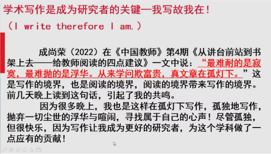 最后,刘老师和大家分享了成为一名研究型教师的意义。鼓励同学们把自己的声音带给更多的人,促进学生核心素养发展,成就赋权同行教师,对社会、对国家教育事业奉献自己的力量。