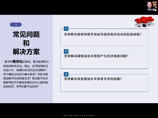 随后,向老师提出教学有效化的实现,要求教师设计有效的教学活动。讲座中,她向同学们展示了三个常见问题并讲解了对应的解决方案。在谈到如何解决教材中教学活动与语言知识无法匹配的问题时,她提出三个“设计”,通过设计主题,设计形式以及设计问题来密切联系语言知识和活动任务,帮助学生参与学习,拓展思维,有效记忆并达到以问促思,以问促学的效果。讲到如何解决课堂丰富却产生负迁移的问题时,她认为需要做到四点,分别是聚焦情境,点播知识,示范话题和分解任务,以此来激发学生学习兴趣,丰富学生语言,指导学生实践延伸思考。提及学生英语水平参差不齐的问题时,她指出要“备”学生,从听、读、说到思、析、辨的内化和构建,让学生在深入阅读的过程中得到表达观点的鼓励,使学生在潜移默化中敢于去说英语,用英语。