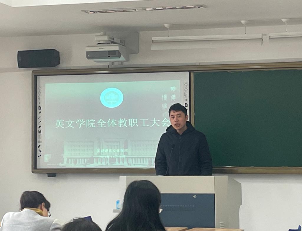 召开全体教职工大会,集中通报期中教学反馈情况并对英语(师范)专业预认证工作中存在的问题和改进措施作简要说明。会议由院党总支部书记毛立峰主持,学院全体教职工共同参与此次会议。