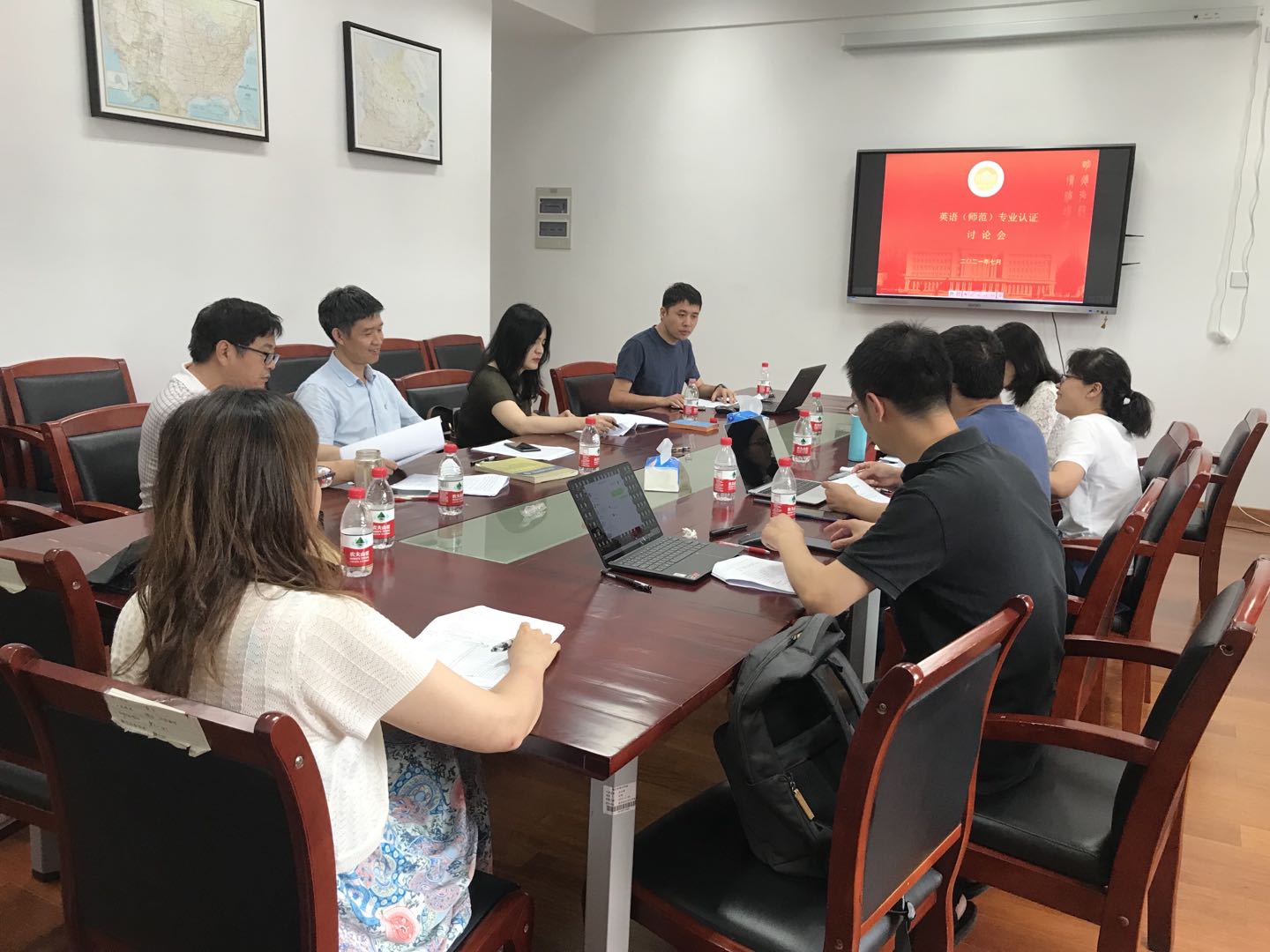 7月26日, 国产av 召开英语(师范)专业认证申请书撰写讨论会。学院党总支书记、副院长、英语系系主任参加了会议。会议还邀请了国产av 教务处、教学评估中心、教育学院的领导到场指导。