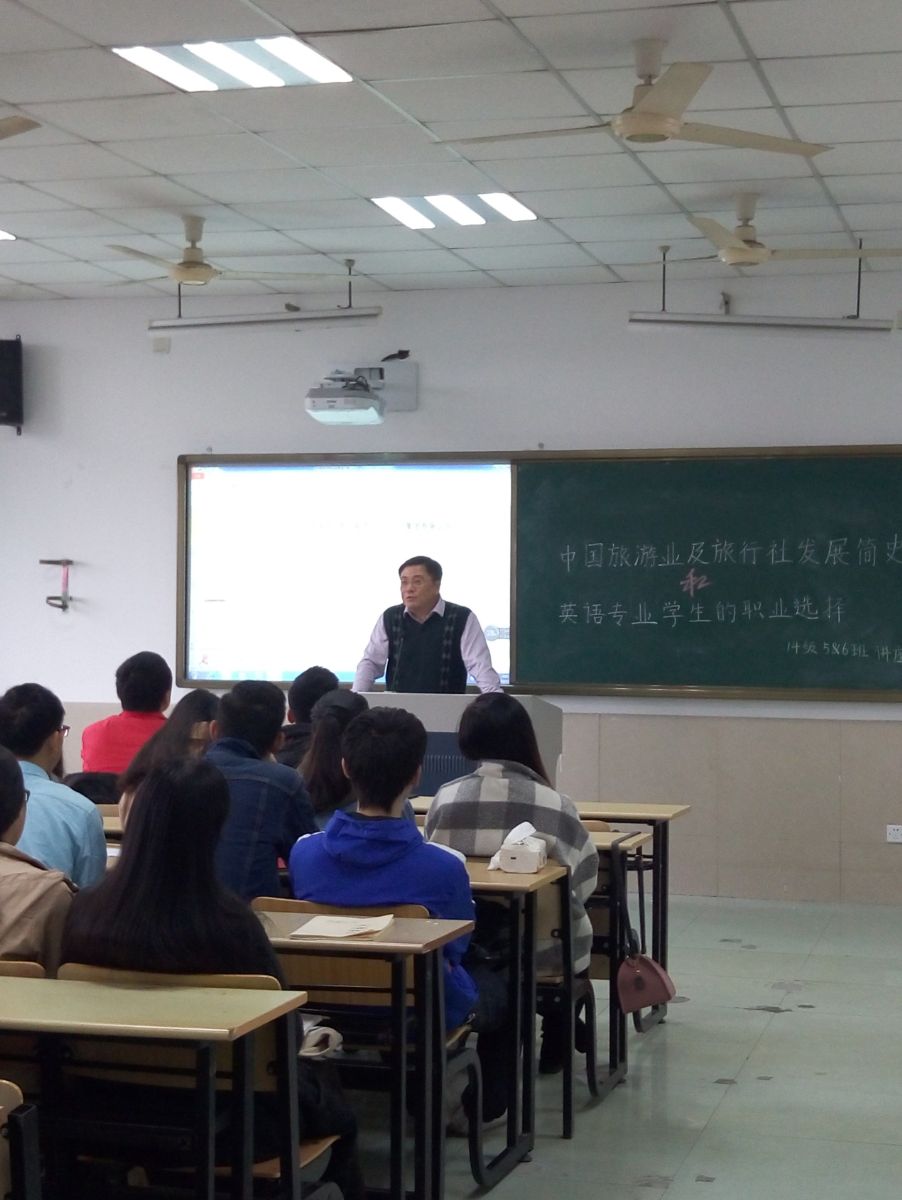 英语专业(旅游方向)学生作了一场题为“中国旅游业及旅行社发展简史和英语专业学生的职业选择”的精彩演讲,英语系主任朱武汉老师出席并主持了讲座。