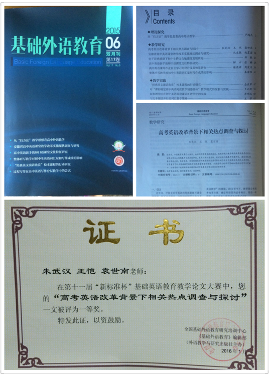 日前,由英文学院英语系朱武汉博士、2012级英语师范专业学生王恺、袁世南共同撰写的题为“高考英语改革背景下相关热点调查与探讨”一文荣获由全国基础外语教育研究培训中心、《基础外语教育》编辑部联合主办的第十一届“新标准杯”基础英语教育教学论文大赛一等奖。论文在《基础外语教育》2015年12月双月刊上刊印。2016年4月,教育部主管、中国人民大学主办的国家级核心期刊《中学外语教与学》全文转载刊登该论文。这是英语师范专业师生在论文领域斩获的一项殊荣。